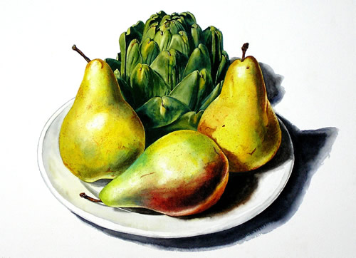 3 Pears and Artichoke on Plate - 15x19